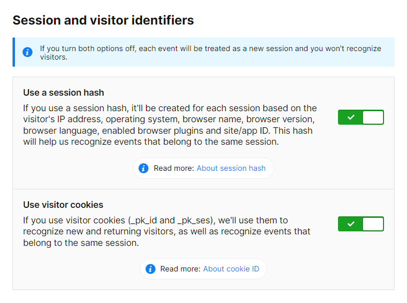 - No visitor data is saved and every event is recorded separately. Essentially, your instance doesn’t record sessions.