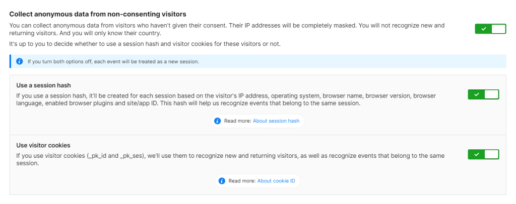The major advantage of this approach is that duplicates of sessions are non-existent. The data collected is more trustworthy than any other anonymous data tracking method. Moreover, if a visitor changes their mind during a session and consents to tracking, the session identifier turns into a first-party tracking cookie that will last longer than 30 minutes.